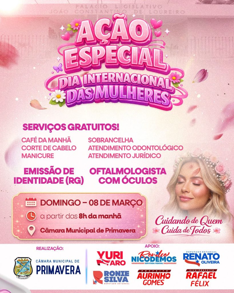 Em alusão ao Dia Internacional da Mulher, a Câmara Municipal de Primavera promoverá, neste domingo dia 08 de Março uma ação especial voltada à valorização, reconhecimento e cuidado com as mulheres do município. A iniciativa tem como objetivo proporcionar um momento de atenção, bem-estar e integração social, oferecendo diversos serviços gratuitos à população feminina, como: